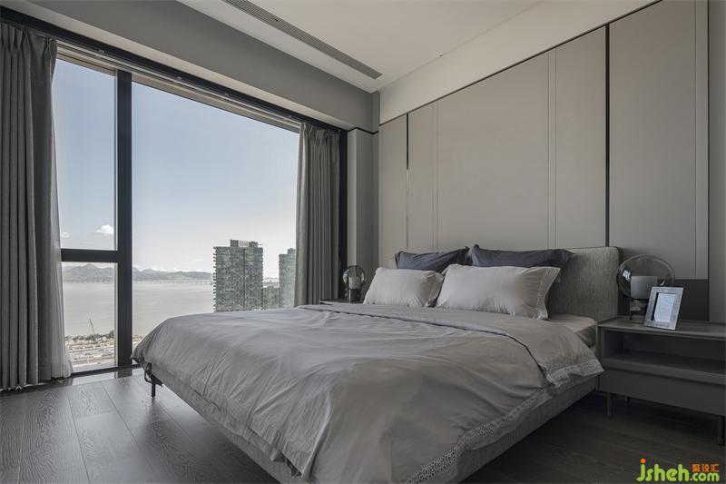暖灰色紋理大床搭配高級(jí)灰硬包背景墻,以黑色不銹鋼線條為裝飾,刪繁就簡(jiǎn),展現(xiàn)極簡(jiǎn)現(xiàn)代的藝術(shù)氛圍。深圳豪宅設(shè)計(jì)溫煦的陽(yáng)光透過(guò)輕紗映暖軟裝色調(diào),柔軟了灰度的冷硬感,為空間注入優(yōu)雅內(nèi)斂的韻味。