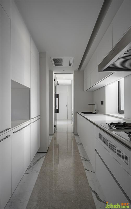 一字型的廚房設(shè)計(jì),從地磚、墻磚到櫥柜,從材質(zhì)、選型到顏色搭配,深圳豪宅設(shè)計(jì)淡雅的白色充斥著整個(gè)空間,搭配黑邊線條點(diǎn)綴,打造時(shí)尚的現(xiàn)代極簡(jiǎn)感。
