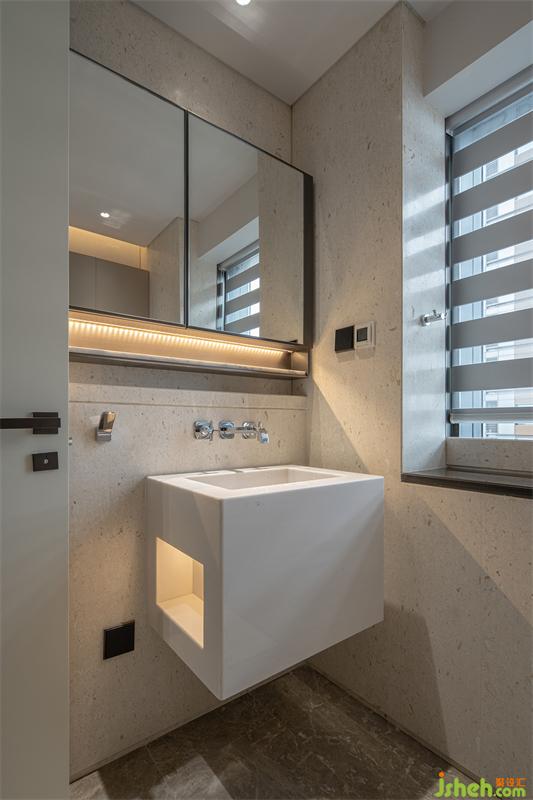 次衛(wèi)以玻璃隔斷作為干濕分離,地面使用大理石與瓷磚進(jìn)行分區(qū),深圳豪宅設(shè)計(jì)墻面加設(shè)吊柜,收納衛(wèi)生用品及浴巾,增加衛(wèi)生間收納空間。窗簾選用防水百葉簾,美觀又實(shí)用。