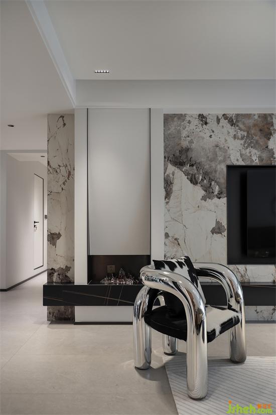 客廳以黑白色系為主,在巖板、烤漆、金屬等材質(zhì)基礎(chǔ)上加入木格柵豐富空間質(zhì)感,沙發(fā)墻一側(cè)更是運用銀色水波紋墻飾裝點,搭配玻璃落地?zé)?,深圳家裝設(shè)計散發(fā)出波光粼粼的光澤。