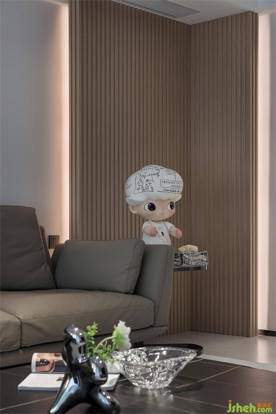 奶呼呼的潮牌玩偶誰能不愛呢!一定要擺放在最醒目的位置!木格柵從沙發(fā)墻連接到轉角位置,內嵌燈帶使得這個角落更有氛圍感。