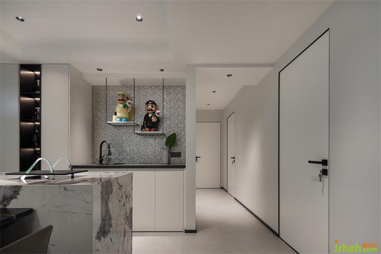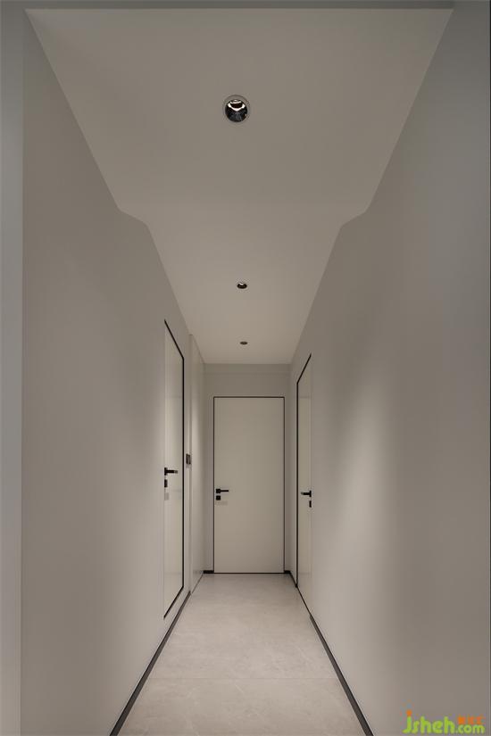過道區(qū)域線條感十足,房門都是極窄邊框的設計,和內嵌踢腳線相呼應,深圳家裝設計黑白灰中性色塑造簡約的科技感。告別千篇一律,每一處細節(jié)都賦予靈性的質感。