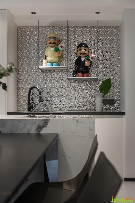 與簡潔的柜子相比,水吧臺上的水波紋背景墻格外顯眼,與沙發(fā)墻的水波紋墻飾相呼應,無形中提升縱深感。深圳家裝設計其上設計了懸空吊架,可以展示收藏的公仔,美觀又實用。