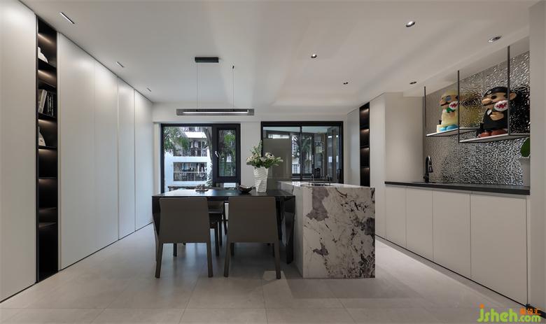 原廚房與餐廳合二為一,這里剛好又是入戶區(qū)域,進門的視野非常開闊。餐廳的兩端都做了整面到頂柜子,鞋柜、餐邊柜、雜物收納柜統統都有,日常囤貨、收藏、展示需求都得到了滿足!中心位置是島臺+可移動式餐桌的組合設計,使用更加靈活方便。