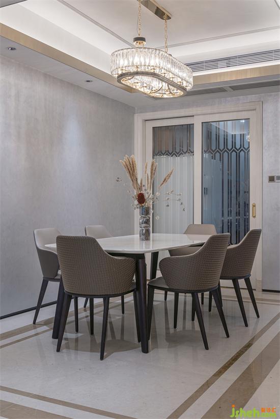 白色大理石餐桌組合米色拼咖色皮面餐椅,金屬質感花瓶點綴,細節(jié)之處均呼應著金、米、咖的暖色系輕奢主題,一家六口的幸福生活,不過一日三餐、一年四季,在平淡的生活里沉淀著不平淡的深情。