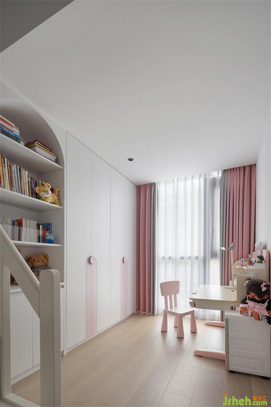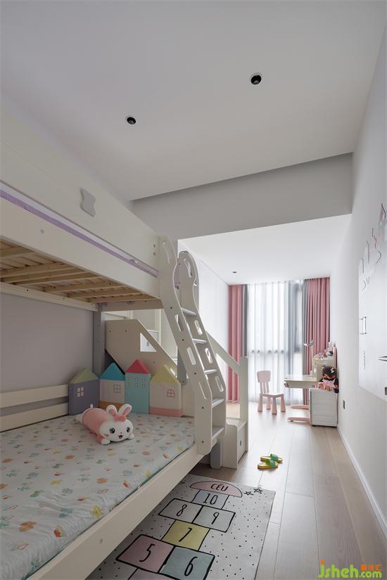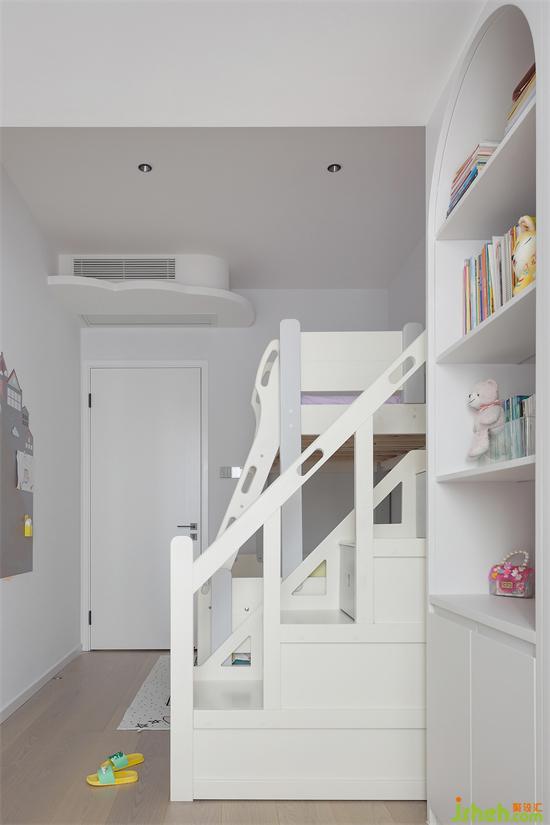 兒童房的落地窗區(qū)域也由原來陽臺外拓而得,高低床、衣柜、書柜一列式的排布,為兒童房創(chuàng)造了學習區(qū)、娛樂區(qū)和休息區(qū),功能齊備也不局促,家裝設計雖然原有天花梁位很低,但小小的半片云朵擱板遮擋,恰巧解決了中央空調的實力搶鏡,還給兒童房增添了一絲童趣。