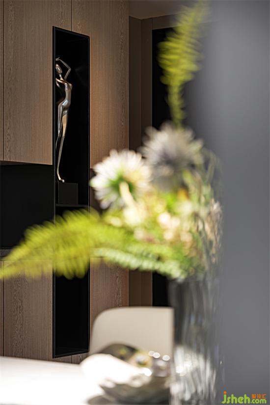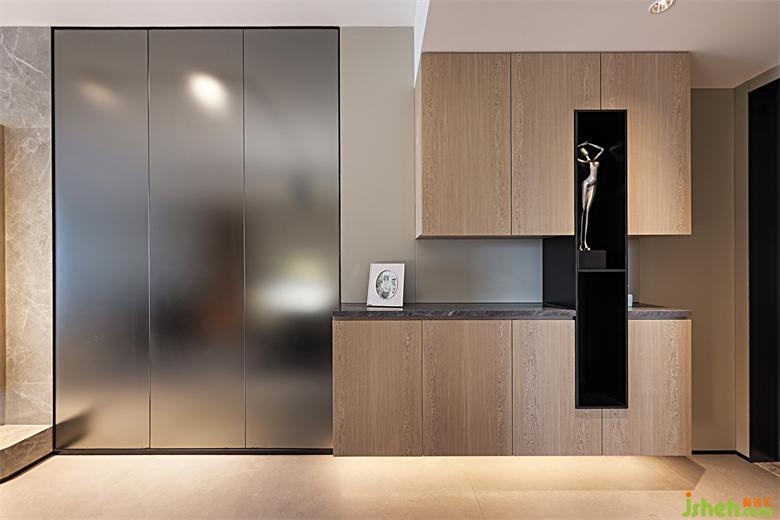 不銹鋼+木質(zhì)的結(jié)合提升空間質(zhì)感,將鞋柜做成上下分體懸浮式造型,搭配大理石臺(tái)面和連接上下柜的開放裝飾格,使得鞋柜區(qū)域變得不再常規(guī),自帶非凡氣質(zhì)。