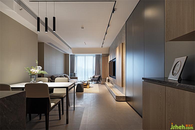為將客餐廳這塊公共區(qū)域盡可能放大,設(shè)計(jì)師可謂是煞費(fèi)苦心,將連同客廳一側(cè)的陽臺(tái)融入背景墻,家裝設(shè)計(jì)加大加寬背景墻尺寸,另側(cè)直接延伸至入門鞋柜處,使得一個(gè)整面融為整體。