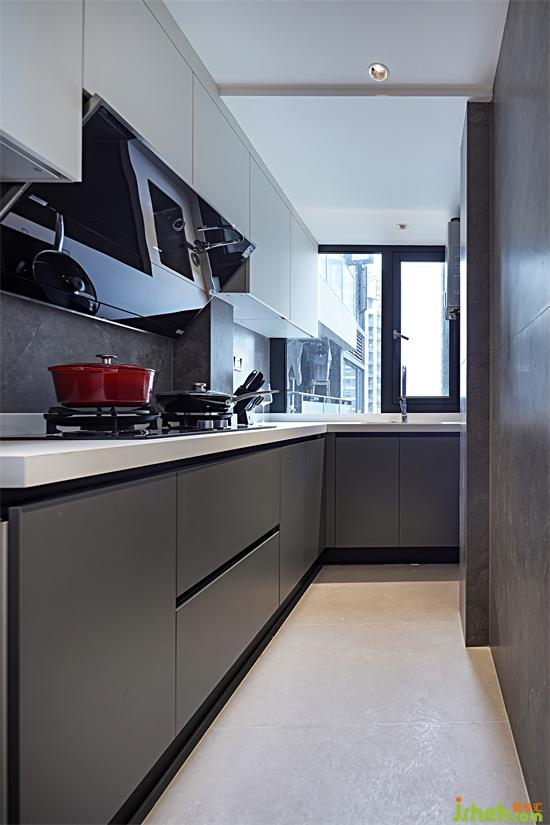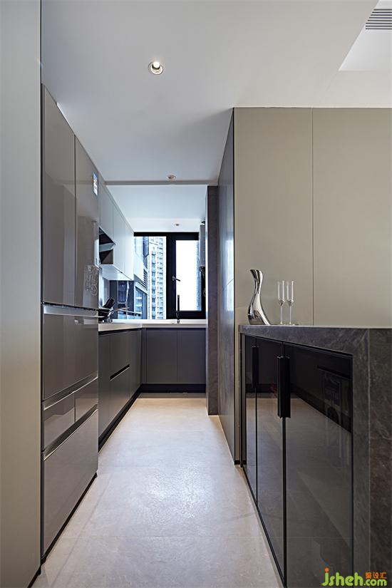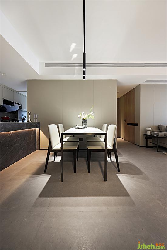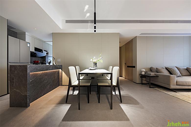 與鞋柜相對(duì)的是廚房和餐廳,因業(yè)主不常做飯,所以將廚房改為開放式和餐廳連接為一體,另一端則一直延伸至生活陽臺(tái),使廚房臺(tái)面和活動(dòng)空間得到擴(kuò)大。