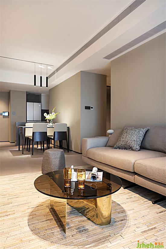 牛皮拼接地毯豐富平面層次感,金色小巧圓形茶幾輕松點(diǎn)綴,沒有過多占空間,反倒把空間襯托得更寬敞了,玻璃面板和閃耀的金色支架造型獨(dú)特,十分吸睛吶~