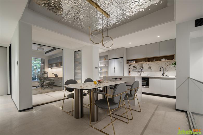 在這里隨處可見(jiàn)元素拼接呼應(yīng),淺色系的應(yīng)用更是讓餐廳視覺(jué)上顯大。天花的水波紋板使暖暖的燈光鋪滿整個(gè)空間,彌補(bǔ)了餐廳光線不足的問(wèn)題。在光的反射作用下,Baxter餐椅的黃銅框架熠熠生輝,燈光柔和不刺眼,餐椅造型極致簡(jiǎn)約,盡顯輕奢大氣!