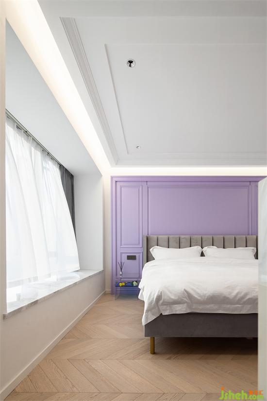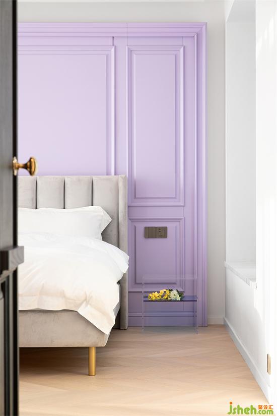 小姐姐希望主臥跟公共區(qū)域有明顯區(qū)分,進(jìn)入臥室要有放下一切煩惱的舒適感。于是,設(shè)計師在主臥的設(shè)計上刻意簡化裝飾感,以仙女標(biāo)配色——香芋紫作為空間的主色調(diào)!床頭背景是一面香芋紫色輕法式護(hù)墻板,搭配漸變色極簡亞克力床頭柜和高級灰高背軟包床,材質(zhì)軟硬結(jié)合,色調(diào)相輔相成,在懸浮吊頂和周邊燈帶的映照下,共塑一室溫柔。