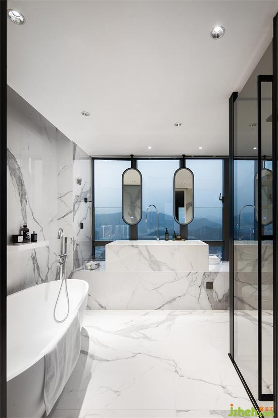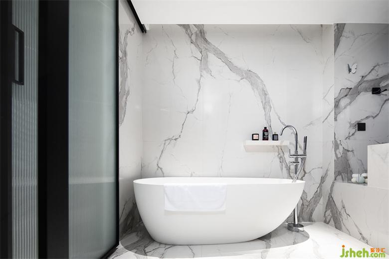 白色落地式獨立浴缸搭配銀色潔具,純凈中透露著高級感。墻面加設(shè)巖板置物架,洗浴用品可以隨手?jǐn)R置,便捷又實用。