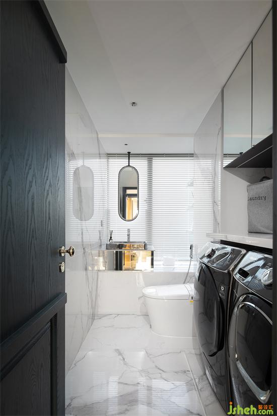 小姐姐在裝修前已選好了洗衣機(jī)和烘干機(jī),計劃安置在客衛(wèi)。設(shè)計師便根據(jù)家電的尺寸規(guī)劃空間收納位置,進(jìn)門右手邊定制到頂浴室柜,中部留空做靈活置物空間,洗衣機(jī)和烘干機(jī)則并排放在地面,日常使用更加便捷。