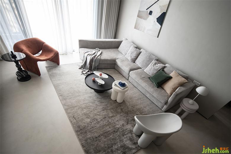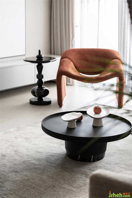 臟橘色點綴為現(xiàn)代簡約的家?guī)頃r尚氛圍,圓形桌更是給嚴(yán)肅設(shè)計帶來一絲活潑跳躍之感。家裝設(shè)計使用弧形元素貫穿整個客廳,加之不同形狀幾何軟裝的疊化設(shè)計,弱化水泥色帶來的嚴(yán)肅感,反倒給這個家?guī)頊剀案杏X~