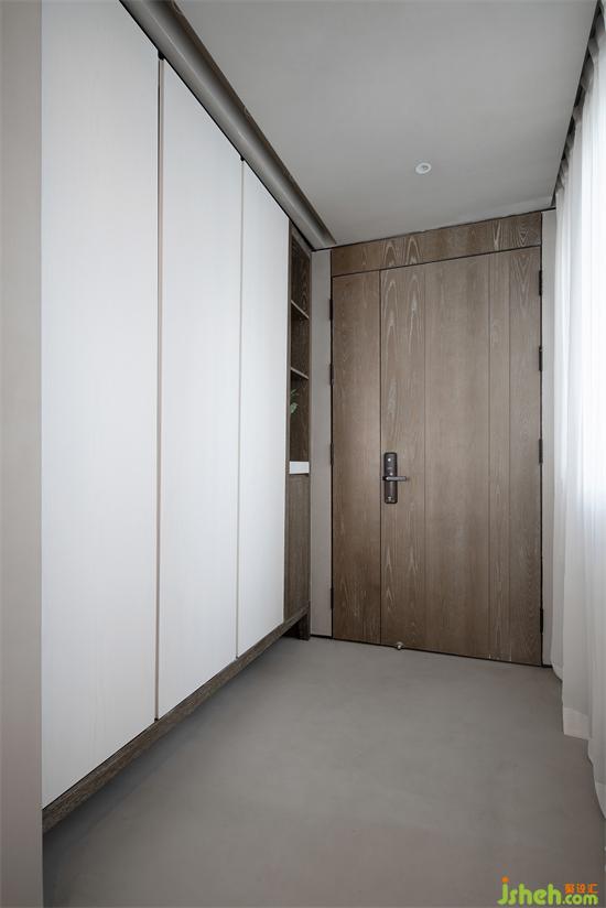 灰色、白色與原木搭配,低調(diào)沉穩(wěn)又大氣,通頂大立柜,讓一家四口的鞋物收納不在話下,集美感和功能性于一體,大面積白色也充分延伸了空間感。