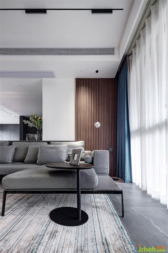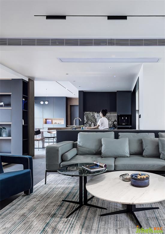 以Y先生最喜歡的深海藍(lán)為基調(diào),搭配沉穩(wěn)、酷雅的深灰色和木色,選用烤漆、大理石、木格柵和絨布等多種材質(zhì),打造極具高雅格調(diào)的現(xiàn)代極簡(jiǎn)空間。
