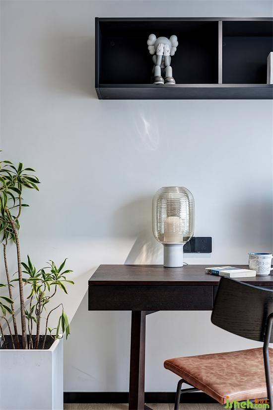 從沙發(fā)起身,邁上一個小臺階,進入書房。家裝設計透過百葉簾的陽光為空間加上了柔光特效,目之所及皆軟和。