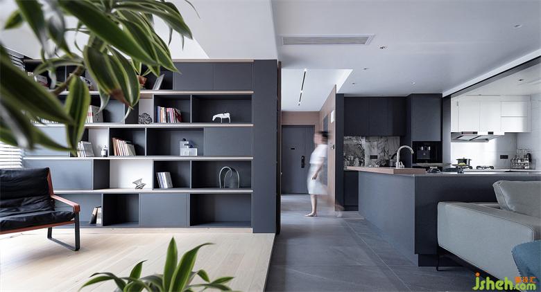 里側(cè)的中廚區(qū)域是潔凈的白色櫥柜,外側(cè)的西廚區(qū)域沿用公共區(qū)域的深灰色調(diào),與過道連接處設計了水吧臺位,日常用水更便利。