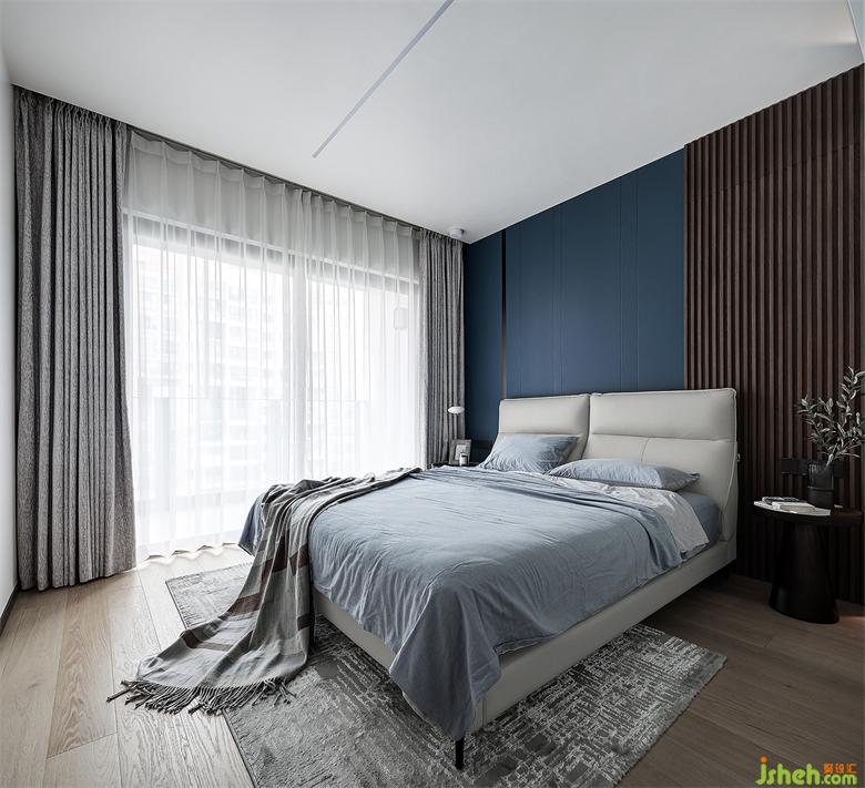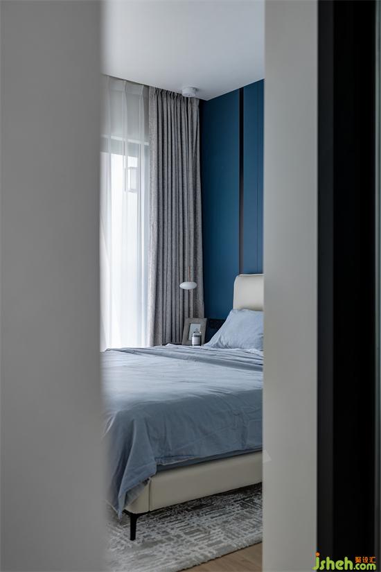 深海藍皮質(zhì)硬包、黑色不銹鋼、木格柵,延續(xù)客餐廳的主要用材,復刻的設計手法令主臥更平衡、和諧。