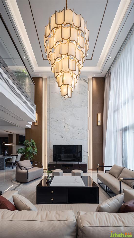 一層大挑空視線開闊,并可以飽覽窗外的海景。仿云彩的電視墻,山水意境的沙發(fā)背景,選擇了木質(zhì)、皮質(zhì)、金屬等材質(zhì),別墅裝飾讓整個空間充滿中國古典之美。