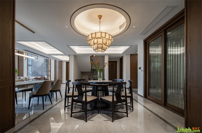 新中式風(fēng)格給家?guī)砹嗽S多沉穩(wěn)的感覺,別墅裝飾設(shè)計師以儒家思想文化基礎(chǔ)做了整個空間的設(shè)計。儒家文化最重要的設(shè)計元素為回形紋,回形紋代表著吉祥如意。這與儒家文化的核心-“仁”也是相符合的。同時,通過整體環(huán)境的營造,自然得將回形紋的設(shè)計元素融入設(shè)計中,從而避免了設(shè)計元素的簡單堆砌。