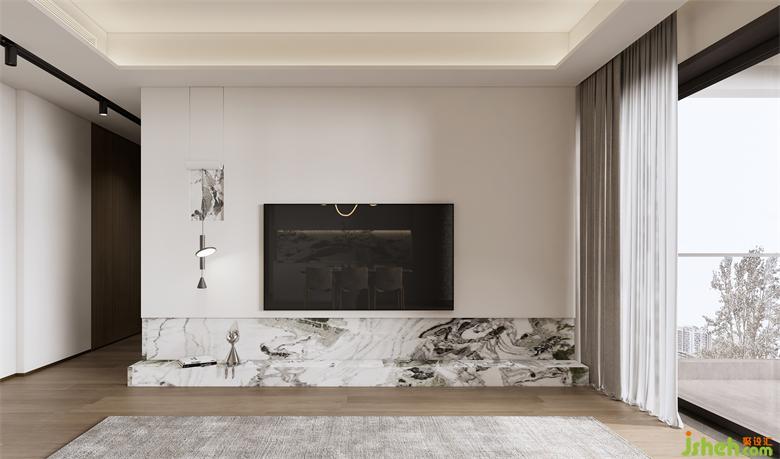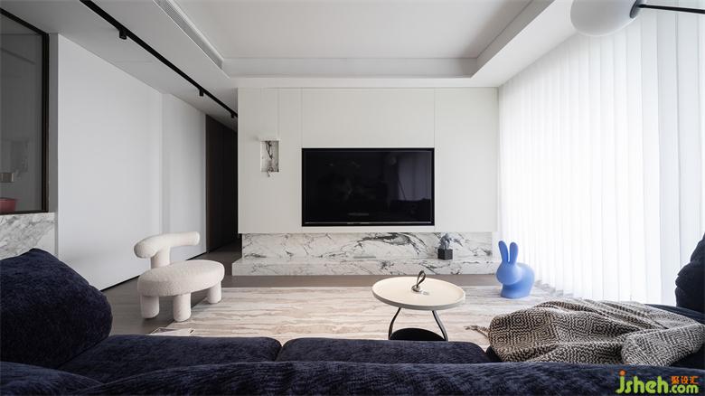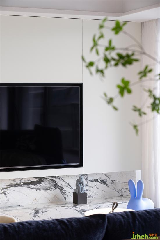 步入客廳,就能感受到現(xiàn)代簡約風(fēng)格的干凈通透。家裝設(shè)計師以白色為主的電視背景墻搭配潘多拉大理石地臺,瞬間搶占了視覺中心,呈現(xiàn)出天然石材流淌的自然質(zhì)感。為保持美觀,提前規(guī)劃電視尺寸大小,四邊預(yù)留3cm寬,更顯精致。