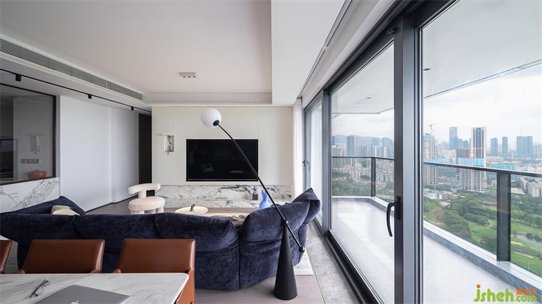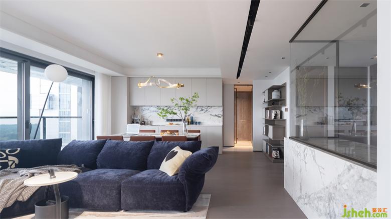 客廳與玄關(guān)、廚房中間的過道較為寬裕,空間動線舒適便捷。家裝設(shè)計師上方的軌道射燈干凈利落,美觀之余補(bǔ)充室內(nèi)光線??蛷d、陽臺以落地玻璃推拉門相隔,光線可以無遮擋地進(jìn)入室內(nèi),整個客廳通透加倍,讓居家空間有著更加愜意的放松感。