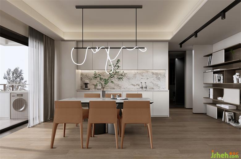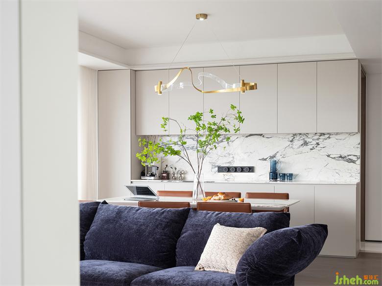 沙發(fā)背后劃分出開放式餐廳,自然區(qū)分空間功能。白色餐桌搭配稍顯厚重的木棕餐椅,百搭亮眼且經(jīng)久耐用。家裝設(shè)計師頂部吊燈宛若飄帶,造型唯美簡約。餐桌背后整墻做餐邊柜,上下吊柜+中部大理石,采用卡其灰板材設(shè)計,低飽和度的色彩沉穩(wěn)大氣,中間的大理石和客廳遙相呼應(yīng),收納功能與顏值雙雙在線~