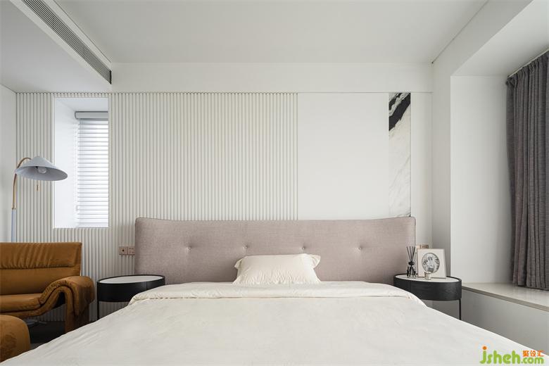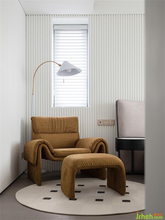臥室設(shè)計(jì)延續(xù)整體簡(jiǎn)約大方的風(fēng)格,以白色木格柵+護(hù)墻板徐徐鋪開(kāi),連續(xù)又有間隙的自然縫造型讓幾何之美充分凸顯,也讓原本平面的墻面富有層次,仿佛白色海浪的漣漪,蕩漾著柔美的夢(mèng)境。家裝設(shè)計(jì)師亮眼有質(zhì)感的棕黃沙發(fā)和腳凳,做工考究的柔軟地毯,低調(diào)灰的夢(mèng)幻窗簾,無(wú)一不彰顯著生活情趣與藝術(shù)情調(diào)。