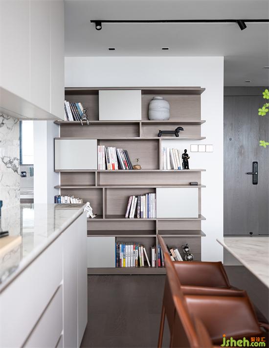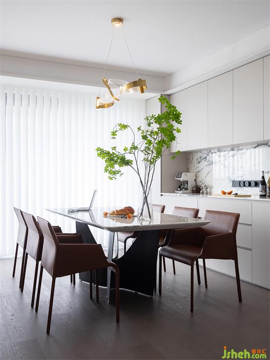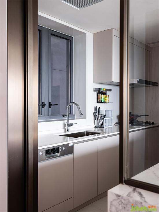 廚房與客廳由黑色邊框玻璃推拉門自然隔開(kāi),時(shí)尚簡(jiǎn)約質(zhì)感滿滿,透明的玻璃讓整個(gè)空間看起來(lái)整潔又明亮,也與客廳形成互動(dòng)關(guān)系。家裝設(shè)計(jì)師廚房?jī)?nèi)部主要以白色和棕色為主,色彩大方耐看,讓烹飪時(shí)光都變得更加干凈舒服。