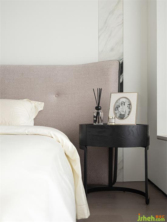 床頭背景墻的熊貓白大理石,暈染般的紋理輕盈飄逸,是令臥室空間質(zhì)感翻倍的神來(lái)之筆。家裝設(shè)計(jì)搭配Poliform的Rever床,寬大的床頭軟包,微妙的傾斜角度貼合人后背,舒適性極強(qiáng)??勘忱c(diǎn)細(xì)節(jié)設(shè)計(jì),盡顯優(yōu)雅大氣,彰顯獨(dú)特韻味。兩側(cè)床頭柜對(duì)稱擺放裝飾,布置出一個(gè)極具安全感的臥室休息空間。