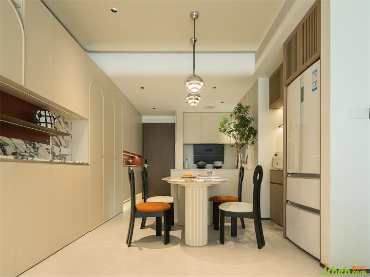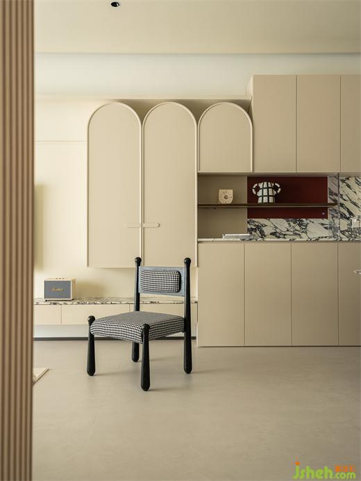 2、餐廳與公衛(wèi)之間做s形墻,使餐廚一體化且擴(kuò)大整個(gè)空間的比例。