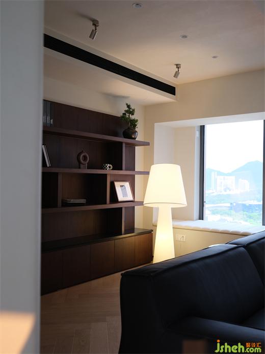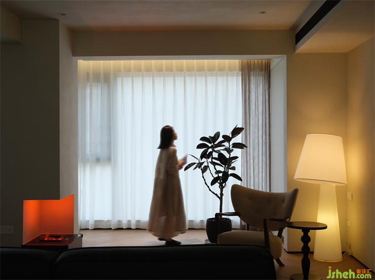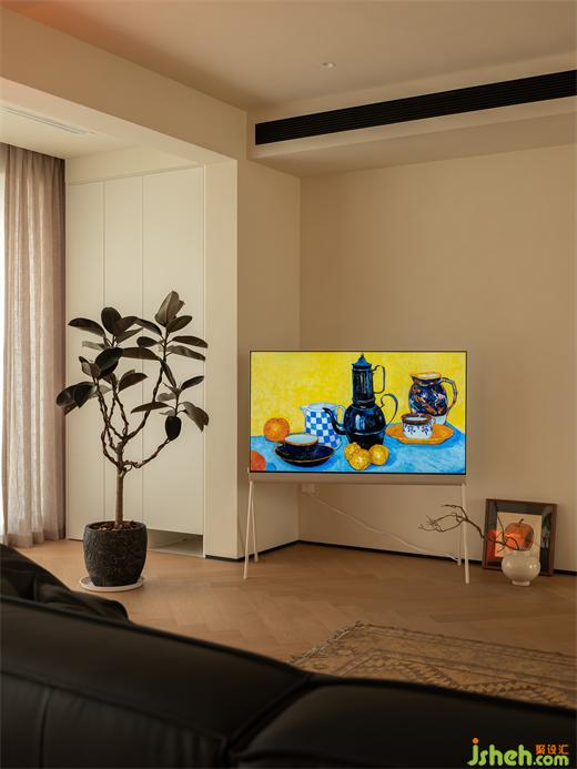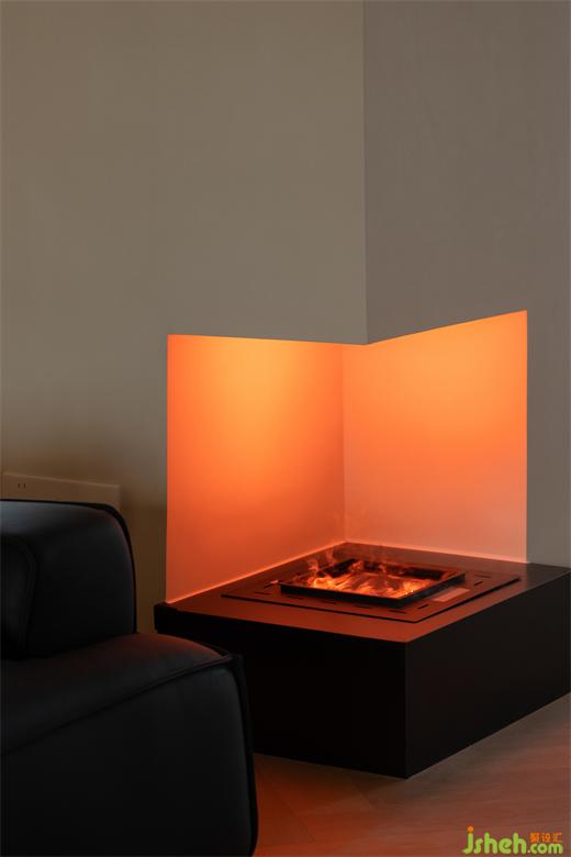 2、巧妙利用陽臺包柱空間打造壁爐裝飾,增加客廳氛圍感與設(shè)計亮點。