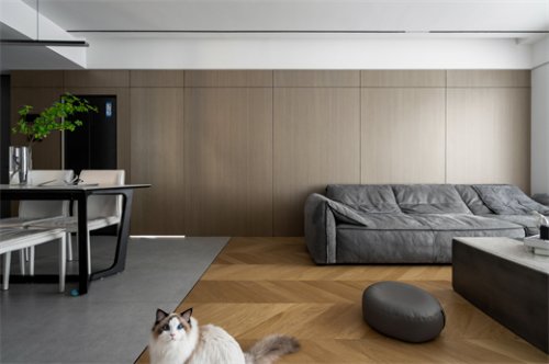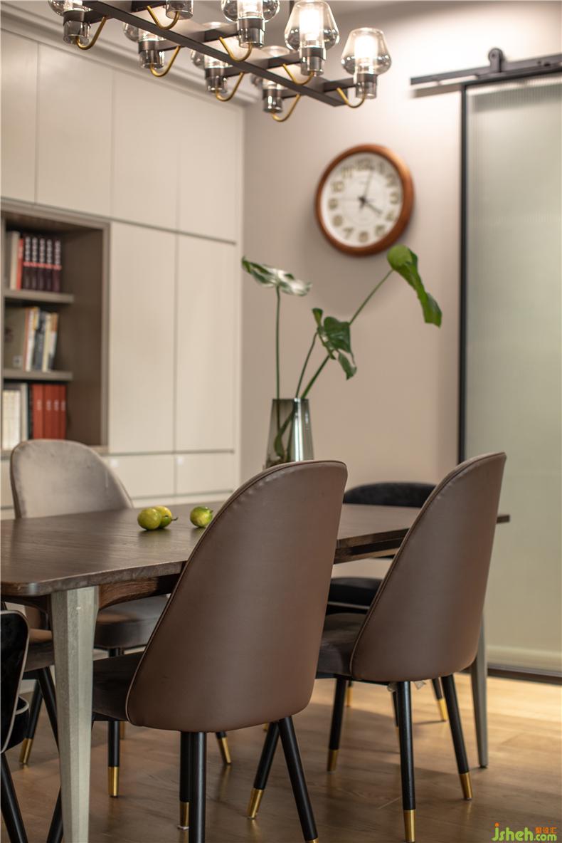 開放式的客餐廳,太過空曠的空間給人感覺冷清,所以地板色調(diào)我們選擇了咖啡色系,L小姐在選擇地面材質(zhì)時也是在地磚和地板兩者間選擇考慮了很久,為了營造家庭的溫馨感最終還是選擇了地板,小朋友光腳在上面玩耍也不會覺得冷冰,木屬于大自然的贈予,在質(zhì)感上更加樸實有溫度。