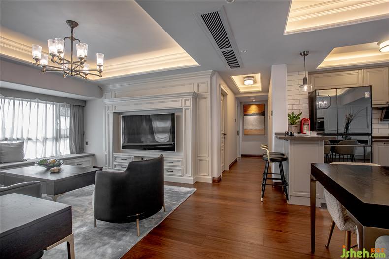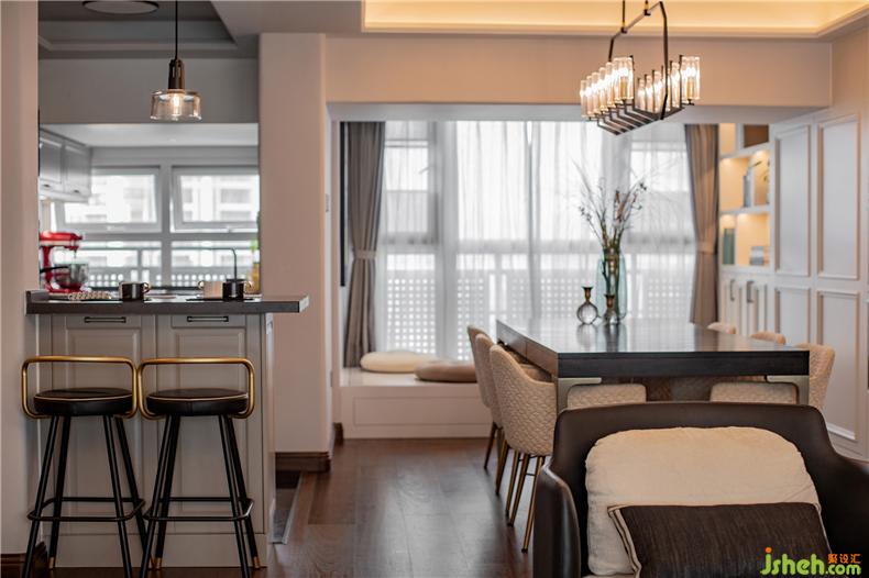 120㎡的房子,把挑空的入戶花園收入囊中,利用樓梯底下的空間做了超大的鞋柜,以及能同時看住兩個孩子做作業(yè),又不會挨著一起相互影響的學(xué)習(xí)桌。樓上更是多了一個女主人心心念念的衣帽間。室內(nèi)設(shè)計師以功能作為區(qū)分點,看電影、喝酒、吃飯、玩游戲橫向鋪開,不再像以前一樣都擠在客廳里。三三兩兩各不打擾,業(yè)主不滿意于原來的餐廳廚房空間大小,室內(nèi)設(shè)計師以西廚柜子作為隔斷,分開入戶和餐廳,實用美觀兩不誤。