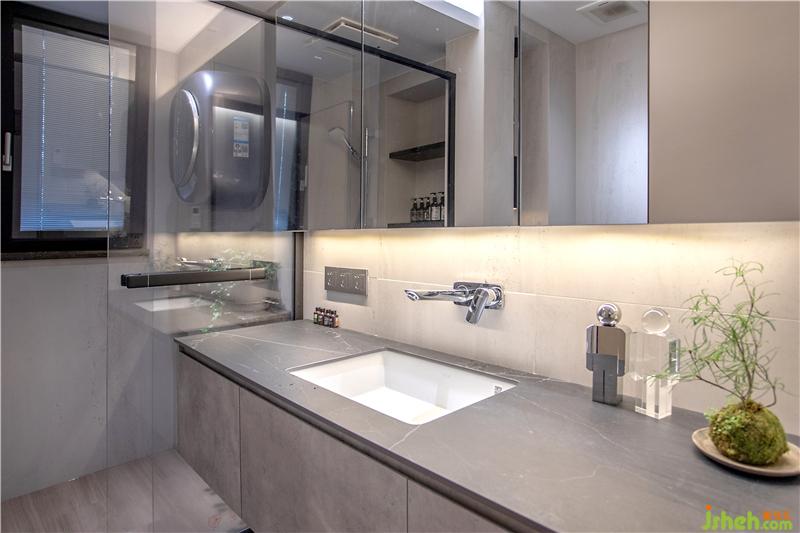 公衛(wèi)的格調(diào)與房子的整體設(shè)計(jì)保持一致,干凈舒適。暖調(diào)燈光,照出年輕好氣色。同時(shí)主人愛(ài)藏物的小心思再次體現(xiàn),上有三開(kāi)鏡柜,下有三開(kāi)梳洗臺(tái)柜,再多的物品皆可收納。
