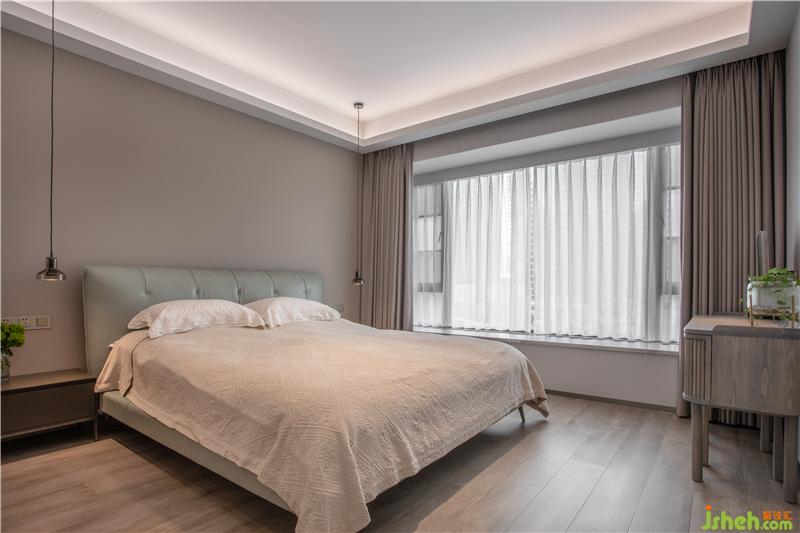 主臥也是極度的簡潔,灰與白的世界,不惹一絲塵埃,除了必要的床褥、衣柜、梳妝柜等必要物什深圳室內(nèi)設(shè)計師,再無其他無必要的裝置,甚至干凈得連一副裝飾畫都沒有。