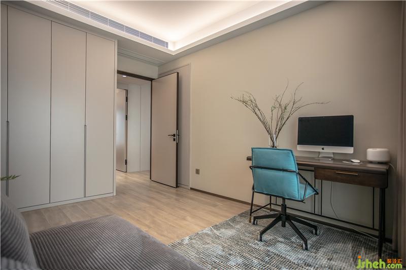 次臥改造成多功能房間,既可以辦公,又可以接待客人,甚至還是孩子的鋼琴房。簡潔清麗,配色暖中帶一點藍(lán)色點綴,十分亮眼。