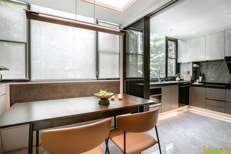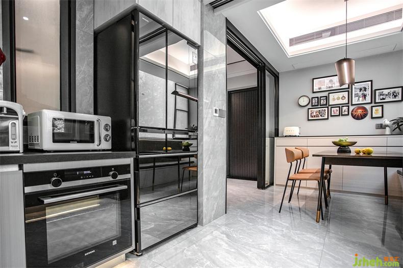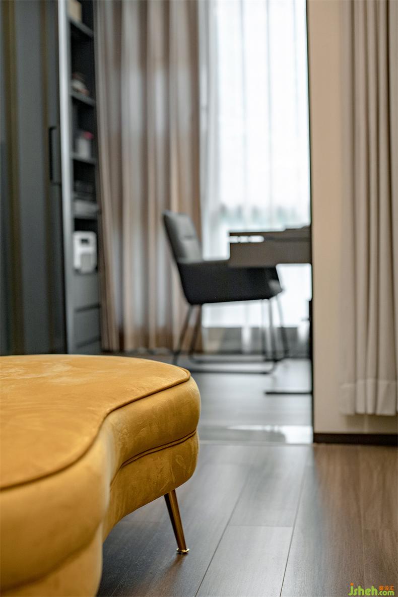 主臥的對面是多功能室,即獨立衣帽間&書房,考慮到整潔性,室內(nèi)設(shè)計師衣帽間一面選用了黑色玻璃柜體,一面是木飾面柜體并鑲嵌了一扇鏡面,經(jīng)常外穿的可以一眼看到,又不會顯得雜亂。