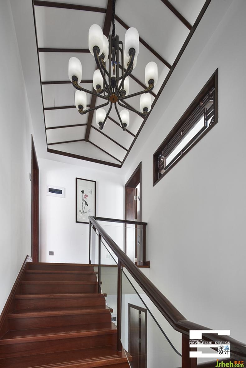 樓梯間天花設計采用木架斜屋頂造型,木質(zhì)溫潤的觸感、淡雅素凈的配色及掛畫的點綴為這上上下下的空間簡單增色。