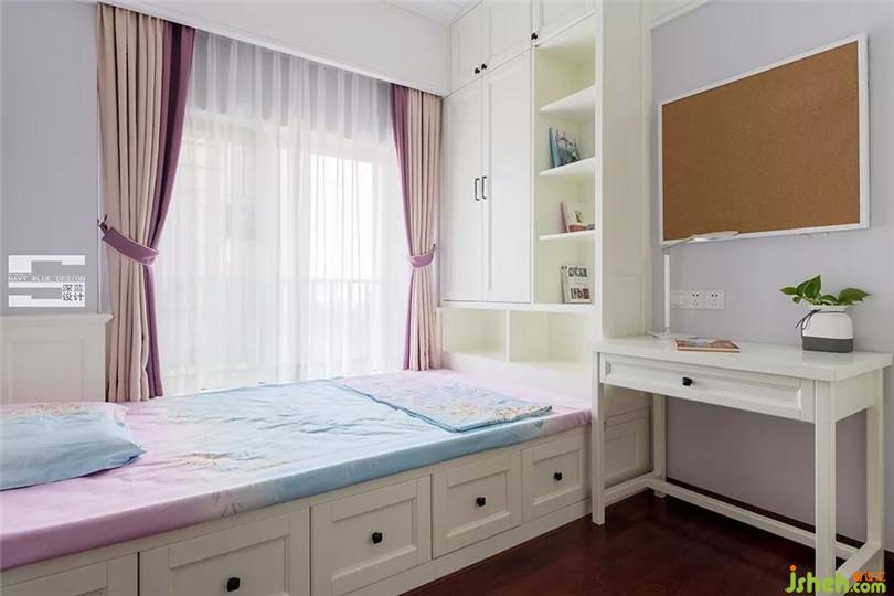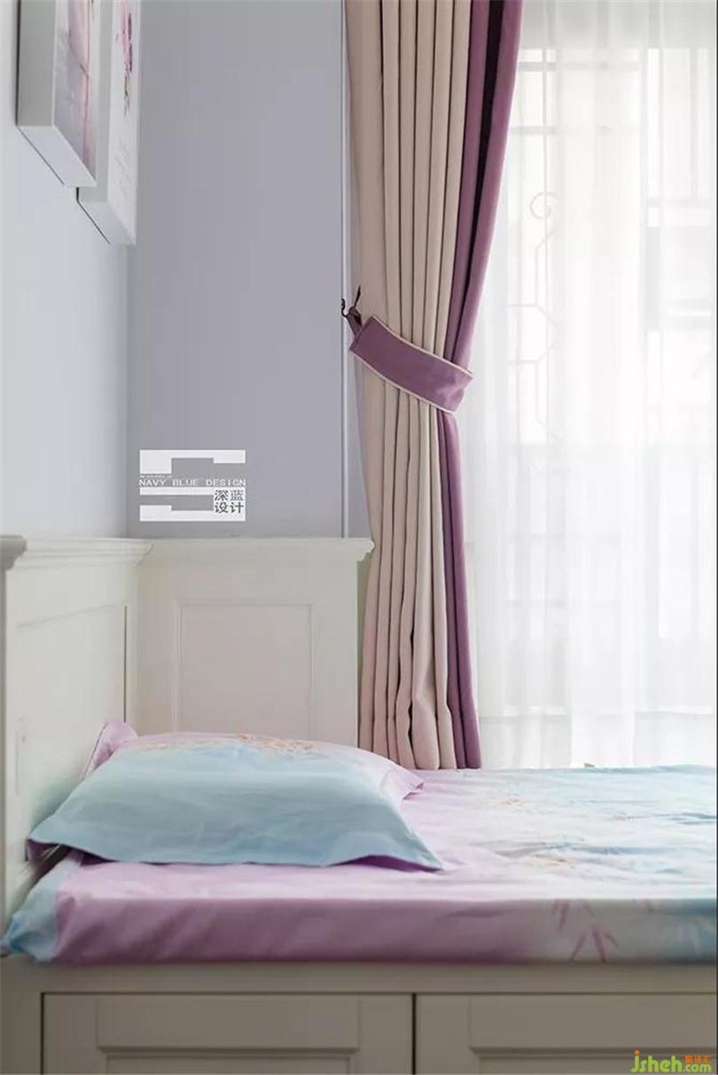 煙紫色與藍(lán)色交織的清爽色調(diào),給女孩編織了一個(gè)輕松愉快的成長環(huán)境??臻g雖小,但設(shè)計(jì)了寫字板、書桌、書架,功能齊全。