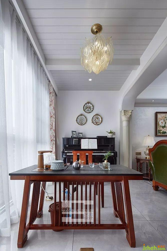 一席茶具道出了現(xiàn)代人對生活返璞歸真的追求,美式掛盤元素穿插其中,打造出一個時尚而又不失自然韻味的清氧空間。坐在這里耳聽風(fēng)聲,覽書品茶,忘卻煩惱。