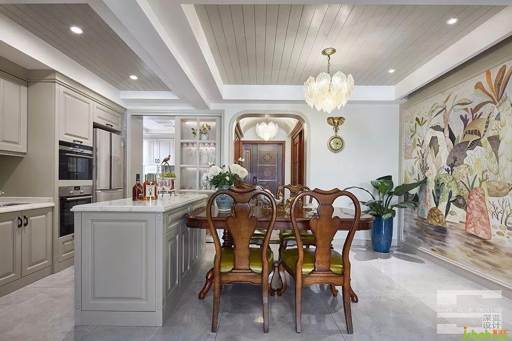 濃郁的古典美式收納柜及地磚的運(yùn)用設(shè)計在燈光的暈染下,富有歷史感和藝術(shù)氣息。配搭著拱形的天花板和線條感十足的裝飾吊燈,融合造型別致的斗牛犬裝置入內(nèi),打造出集生活趣味與藝術(shù)氛圍于一體的美式潮家。