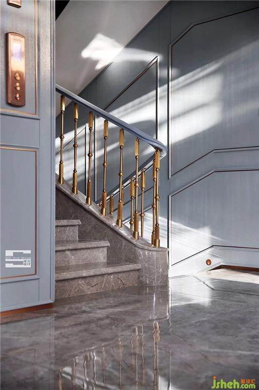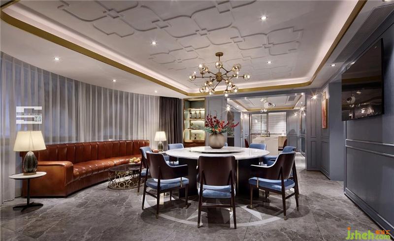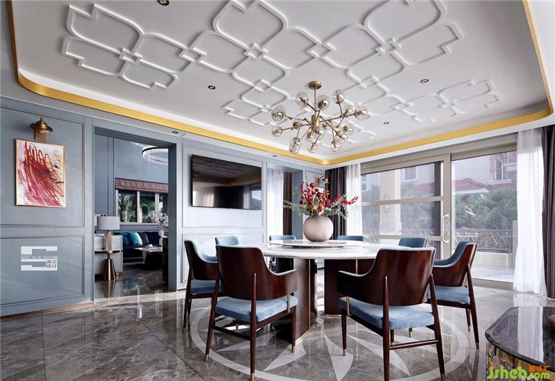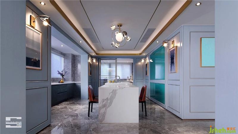 圓在中國(guó)有著一家人團(tuán)團(tuán)圓圓的寓意,在儀式感很重的餐廳中配以白色大理石圓形餐桌,不僅提升空間的亮度,更有助于家人之間情感的升溫;吊頂之下淡雅大理石的圓桌搭配深木飾面座椅,椅腿與阿瑪尼的藍(lán)色絲絨坐墊,無一不從細(xì)節(jié)上展現(xiàn)設(shè)計(jì)師的巧妙心思;金屬邊框紅色藝術(shù)掛畫打破靜謐的氛圍,使餐廳多了一份熱鬧、活潑,仿佛聽到一家人圍坐在餐桌邊吃飯時(shí)歡聲笑語(yǔ)。