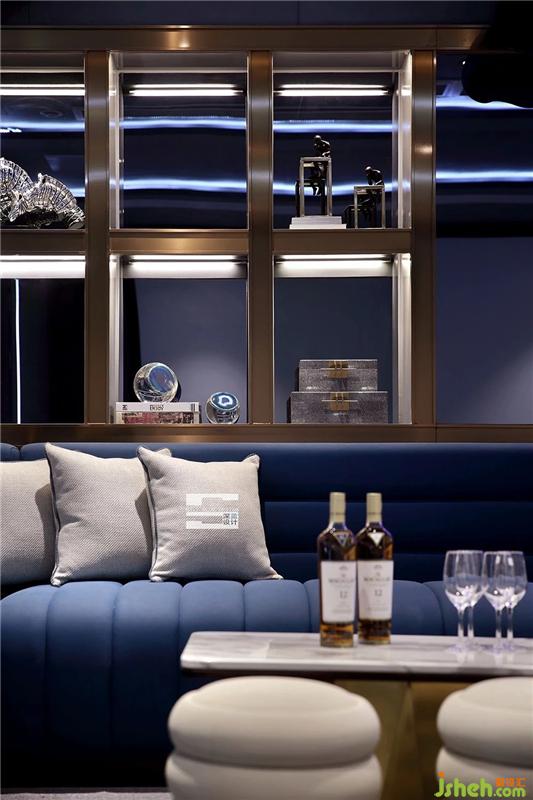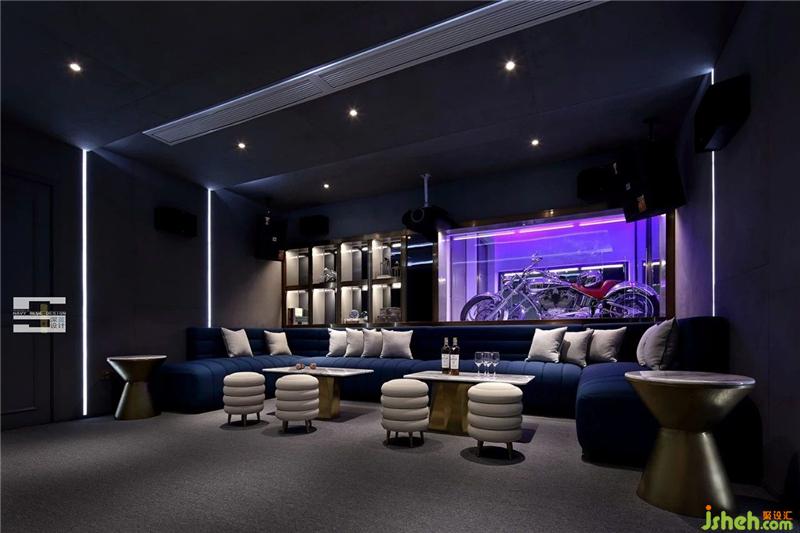 整個(gè)空間以灰色為主調(diào),搭配科技感十足的燈光,讓空間更具層次感;圓潤(rùn)造型的U型寶石藍(lán)絲絨沙發(fā)以及自然舒適的淺灰色抱枕、茶幾凳讓空間充滿溫馨感,在此容納家人促膝長(zhǎng)談,談心嬉鬧的美好記憶;展示墻金屬邊框、金屬大理石茶幾、金屬椅腳等金屬元素在暗黑的影音室里散發(fā)一股低調(diào)奢華的氣息,卸除不必要的裝飾,所有線條克制而必須。