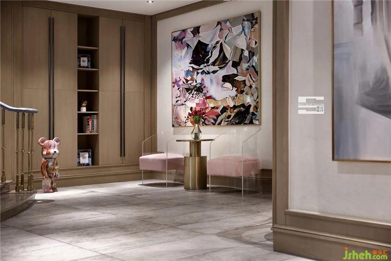 地下室門廳以淺色木飾面與米色墻面為基調(diào),透明粉色絲絨座椅與金屬元素相配合,彰顯主人的優(yōu)雅品味,使空間更加舒適柔和;大幅彩色油畫與BR@RBRICK彩色積木熊相呼應(yīng),提升空間藝術(shù)感。