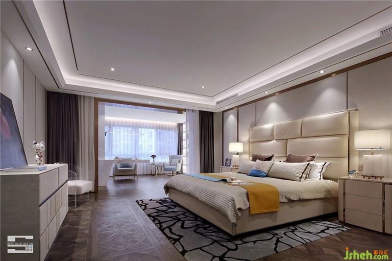 主臥作為業(yè)主私密與盡情放松的空間,細(xì)節(jié)決定品味,意大利真皮大床、柔軟的床品、絲絨面料抱枕等,或藍(lán)或黃的毯子和裝飾品,恰到好處點(diǎn)綴;主臥線條簡約而克制,而木花紋地板與米白色家具柔和空間的硬度,使得室內(nèi)裝置與材質(zhì)建構(gòu)之間,多了一份簡單、純粹、舒適的生活質(zhì)感;Cosmos限量版星際熊手辦、石紋進(jìn)口地毯,提升臥室的藝術(shù)感,彰顯業(yè)主的高貴品味。