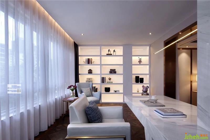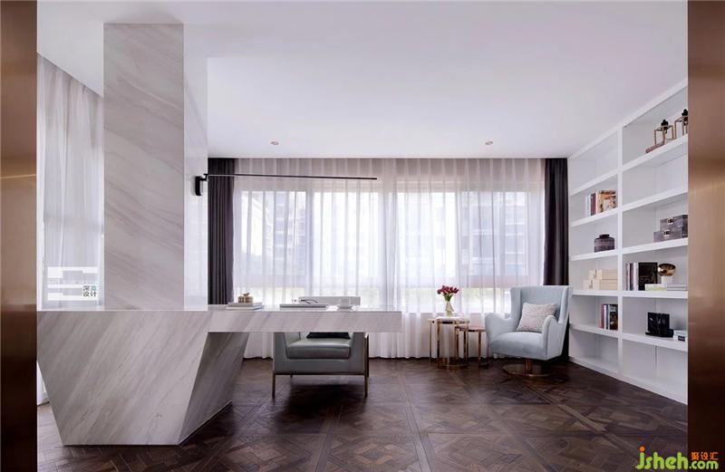 就像這個(gè)臥室,延伸出的小書房,簡潔的家具包裹著材質(zhì)、紋理、觸感的細(xì)節(jié),無不表達(dá)出生活品質(zhì)的追求,可以靜坐窗邊聽雨,也可以品酒讀書,感受生活的質(zhì)感在指尖流淌。