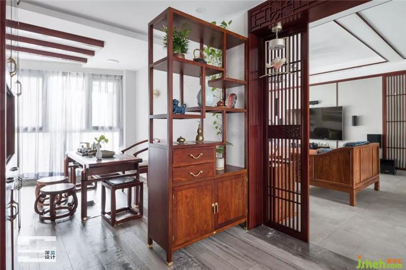 設(shè)計(jì)師根據(jù)業(yè)主的需求和利用空間的優(yōu)勢(shì),將入戶花園改造成茶室和雜物間,大大提高空間的利用率,增加收納空間;設(shè)置深棕木色置物柜進(jìn)行區(qū)域劃分。